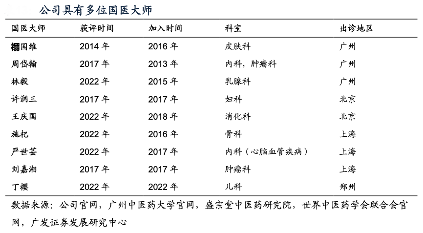 經(jīng)典案例:根據(jù)公司官網(wǎng)、廣州中醫(yī)藥大學(xué)官網(wǎng)、盛宗堂中醫(yī)藥研究院、世界中醫(yī)藥學(xué)會(huì)聯(lián)合會(huì)官網(wǎng)、廣發(fā)證券發(fā)展研究中心等綜合資訊表明,“中醫(yī)看人”,多位國(guó)醫(yī)大師、國(guó)家級(jí)和省市級(jí)名中醫(yī)坐鎮(zhèn)固生堂,為集團(tuán)提供可 靠背書(shū),樹(shù)立品牌打響知名度。截至2022年12月31日,固生堂在全國(guó)共擁有9名多點(diǎn)執(zhí)業(yè)的國(guó)醫(yī)大師, 數(shù)量排名第一。