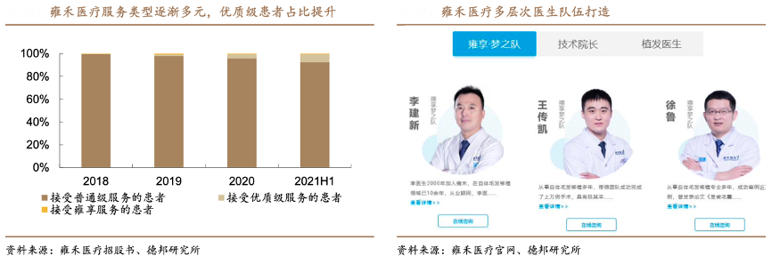 經(jīng)典案例:根據(jù)雍禾醫(yī)療招股書、雍禾醫(yī)療官網(wǎng)、德邦研究所等綜合資訊表明,雍禾醫(yī)療公司提供三級根據(jù)醫(yī)生經(jīng)驗及技能加以區(qū)分的植發(fā)醫(yī)療服務(wù),包括:1)普通級服務(wù):針對接 受標準植發(fā)手術(shù)的患者,收取人民幣 2 萬元至 3 萬元;2)優(yōu)質(zhì)級服務(wù):針對院長、主任或副主任進行升級和定制化植發(fā)手術(shù)的患者,收取 3 萬元至 5 萬元;3)貴賓級雍享服務(wù):針對接受由業(yè)內(nèi)知名植發(fā)專家進行個性化植發(fā)手術(shù)的患者,收取逾 10 萬元。