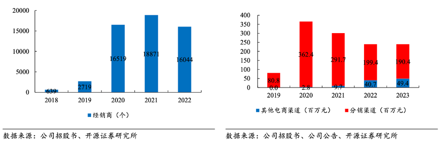 經(jīng)典案例:根據(jù)公司招股書、公司公告、開源證券研究所等綜合資訊表明,巨星傳奇公司通過 IP 賦能私域流量轉(zhuǎn)化,推動消費(fèi)者向分銷商及 KOC 裂變。公司借助昆山汀奢分銷產(chǎn)品的分銷代理向相關(guān)經(jīng)銷商提供在線銷售和營銷方面的輔助及培訓(xùn),由此建立有效的分銷網(wǎng)絡(luò),2022年公司在全國擁有超過 16000 個經(jīng)銷商。