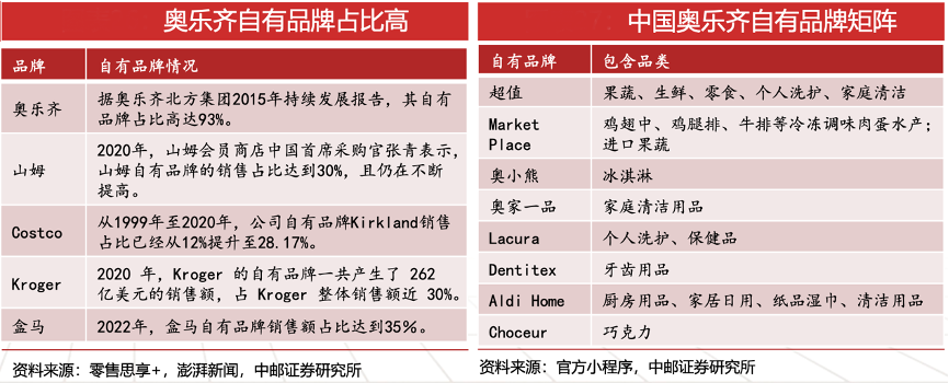 經(jīng)典案例:根據(jù)零售思享+、澎湃新聞、官方小程序、中郵證券研究所等綜合資訊表明,異于一般商超20%-30%的自有品牌率,奧樂齊自有品牌占比高達(dá)93%。以中國奧樂齊為例,目前中國奧樂齊主打“超值”品牌系列,伴隨奧小熊、奧家一品等細(xì)分品類自有品牌,共同構(gòu)成了中國奧樂齊“低 價+高性價比”的自有品牌矩陣。