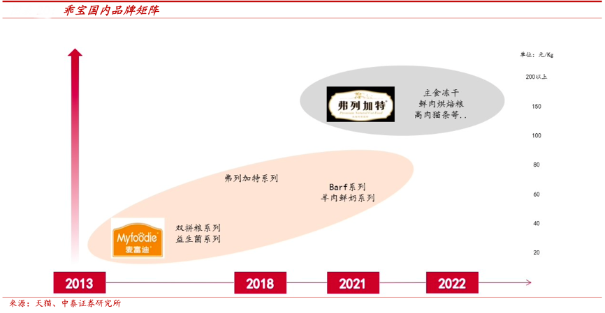 經(jīng)典案例:根據(jù)天貓、中泰證券研究所等綜合資訊表明,乖寶寵物公司2021年進階高端市場,完善品牌矩陣,提升品牌調(diào)性。2021年公司推出子品牌弗列加特(高端貓糧),收購雀巢普瑞納旗下美國品牌 Waggin’Train(高端犬糧),代理 K9 進軍高端寵食市場。