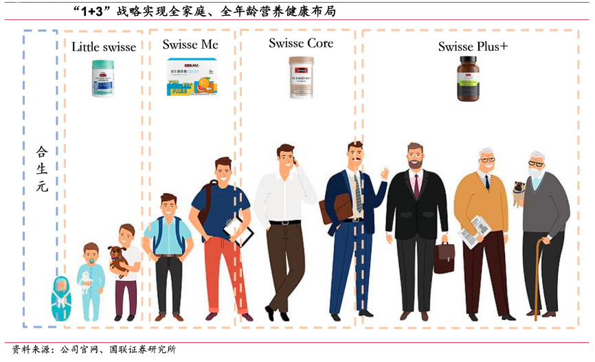 經(jīng)典案例:根據(jù)公司官網(wǎng)、國聯(lián)證券研究所等綜合資訊表明,H&H 控股于 2015 年收購澳洲品牌 Swisse 進(jìn)軍成人營養(yǎng)護(hù)理行業(yè),現(xiàn)已形成全家庭、全年齡營養(yǎng)健康布局。“1+3”的品牌策略下,公司的成人營養(yǎng)護(hù)理業(yè)務(wù)從 Swisse Core 主品牌出發(fā),上下延伸出三個(gè)子品牌 Swisse Plus+、Little Swisse 及 Swisse Me。其中Swisse Plus+主要針對35-50歲以上的成熟精英人群,用材高端、功效性強(qiáng);Swisse Me 針對 25 歲以下的年輕族群,產(chǎn)品以軟糖及直飲粉劑等創(chuàng)新劑型為主,口味豐富、便于攜帶、即食性強(qiáng)。