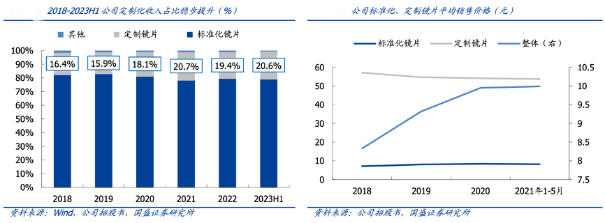 經(jīng)典案例:根據(jù)wind、公司招股書、國盛證券研究所等綜合資訊表明,定制化鏡片對廠商的設(shè)計&生產(chǎn)制造&服務(wù)能力提出較高要求、壁壘較高??堤啬凸径ㄖ苹R片收入占比逐年穩(wěn)步提升,2018- 2022 公司定制化收入從 1.40 億元增長至 3.03 億元(CAGR 為 21.3%),增速快于標(biāo)準(zhǔn) 化鏡片(CAGR 為 15.3%)。截至 2023H1,定制化占比達(dá)到 20.6%。