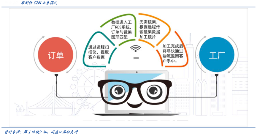經(jīng)典案例:根據(jù)第1眼鏡匯編、國盛證券研究所等綜合資訊表明,康耐特光學(xué)依托 C2M 新業(yè)態(tài)模式滿足終端客戶一站式需求。C2M 模式指工廠直面終端銷售,主要客戶為眼科醫(yī)院/眼鏡店/診所/連鎖店/大型商超/在線網(wǎng)店。公司遠(yuǎn)程系統(tǒng)建設(shè)完善,用戶在線訂單系統(tǒng)下單后,信息直接傳輸至公司軟件&生產(chǎn)設(shè)備;同時也可以和客戶自有系統(tǒng)打通,提升客戶下單便捷性&交付效率。