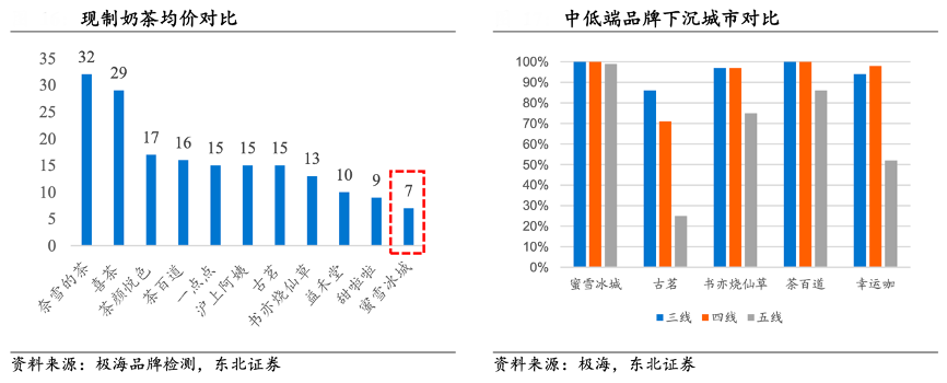 經典案例:根據(jù)極海品牌檢測、極海、東北證券等綜合資訊表明,對比其他連鎖現(xiàn)制茶飲品牌,蜜雪冰城主打極致性價比,其以優(yōu)質平價策略不僅收割了同類型競品的份額,同時承接了包裝茶飲市場中消費升級的需求,因此,公司定位的目標客群廣袤,受眾市場優(yōu)于高端茶飲玩家,且在品牌定位上較其他中端競品更清晰。