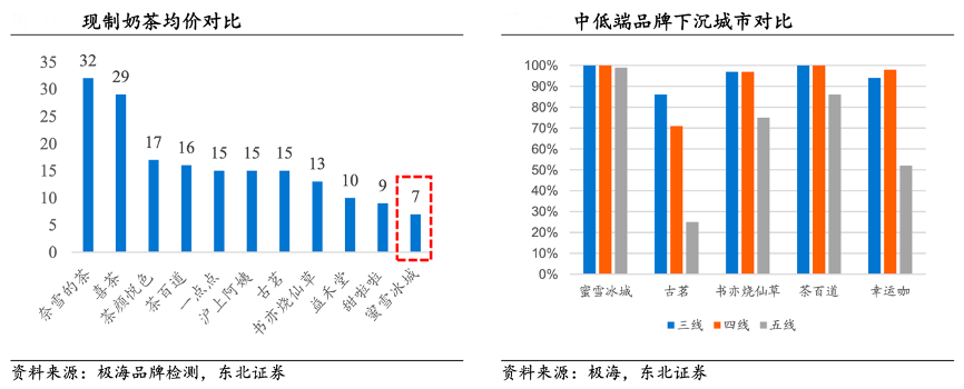 經典案例:根據極海品牌檢測、東北證券等綜合資訊表明,對比其他連鎖現(xiàn)制茶飲品牌,蜜雪冰城主打極致性價比,幾乎沒有競品客單價低于蜜雪冰城。公司以優(yōu)質平價策略不僅收割了同類型競品的份額,同時承接了包裝茶飲市場中消費升級的需求,因此,公司定位的目標客群廣袤,受眾市場優(yōu)于高端茶飲玩家,且在品牌定位上較其他中端競品更清晰。