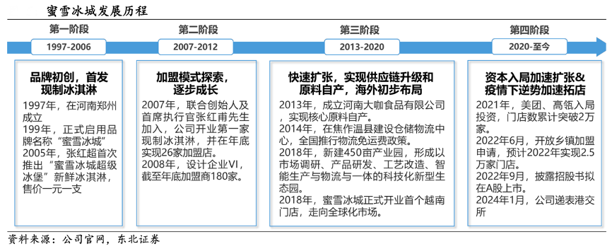 經典案例:根據公司官網、東北證券等綜合資訊表明,2017年,蜜雪冰城公司推出現(xiàn)磨咖啡品牌“幸運咖”;2020 年門店數破萬家,2021 年美團、高領等資本入局,門店數突破 2 萬家,同年公司最大的生產基地于河南投入運營。