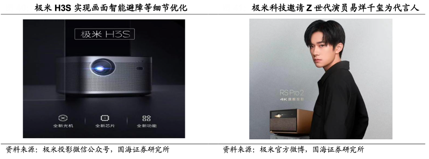 經(jīng)典案例:根據(jù)極米投影微信公眾號、極米官方微博、國海證券研究所等綜合資訊表明,極米引領(lǐng)行業(yè)實(shí)現(xiàn)投影由手動調(diào)焦到自動調(diào)焦,再到全自動調(diào)焦的轉(zhuǎn)變,現(xiàn)階段注重光學(xué)引擎、無感知、幕布對齊、自動避障等細(xì)節(jié)宣傳,新品多領(lǐng)先于同類公司發(fā)布,在注重科技感的 Z 世代心中具有先發(fā)優(yōu)勢;同時(shí)其邀請新生代演員易烊千璽進(jìn)行代言,陽光外形與極米投影儀高顏值相得益彰,實(shí)力派演技與極米技術(shù)優(yōu)勢不謀而合,為 Z 世代傳遞滿滿正能量。