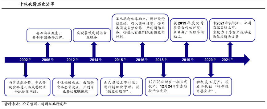 經(jīng)典案例:根據(jù)公司官網(wǎng)、海通證券研究所等綜合資訊表明,2016年千味央廚從思念體系獨立,明確了“只為餐飲、廚師之選”、“餐飲專供速凍米面領(lǐng)導(dǎo)品牌”的企業(yè)定位和發(fā)展方向,成為百勝中國 T1 級經(jīng)銷商;2018年獲得京東集團領(lǐng)投、絕味食品跟投的共計1億元投資,占千味央廚約10%股權(quán),投資完成后公司整體估值約 10 億元。2021 年 9 月 6 日,其在深交所上市。