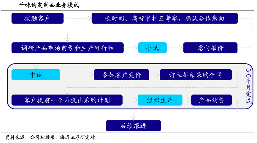 經(jīng)典案例:根據(jù)公司招股書、海通證券研究所等綜合資訊表明,千味公司單獨設(shè)立“重客部”來對大型餐飲企業(yè)客戶提供整體解決方案,包括產(chǎn)品開發(fā)、菜單設(shè)計、技術(shù)支持、提供加工和后廚布局建議等服務(wù)以滿足客戶的多方面需求。其中,定制化的產(chǎn)品研發(fā)服務(wù)是直銷業(yè)務(wù)的 核心,2017-2020 年,公司直銷渠道定制品銷售收入分別為2.1 億元、2.4 億元(+17%)、 3.1 億元(+30%)、2.8 億元(-10%),占直銷收入比例維持在80%以上。