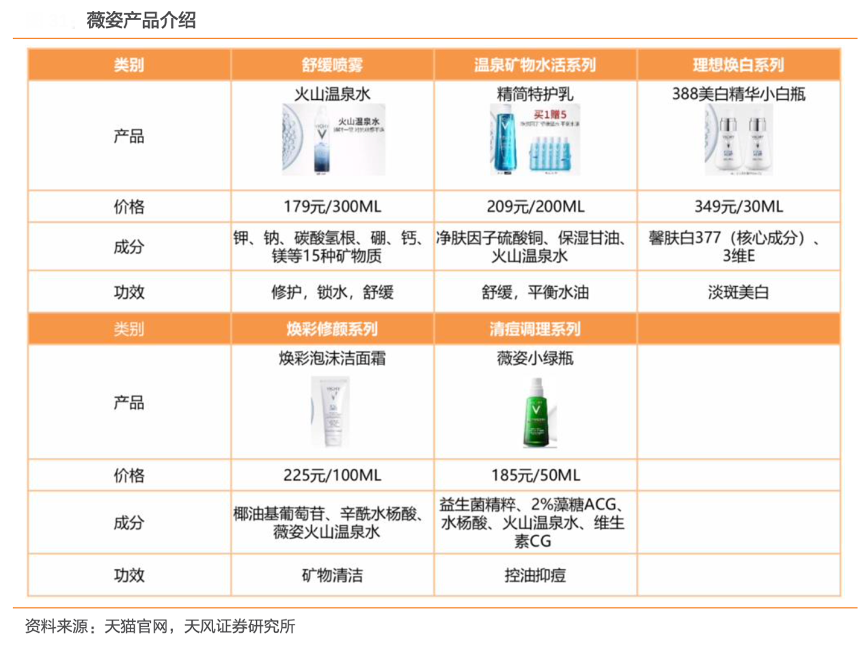 經典案例:根據天貓官網、天風證券研究所等綜合資訊表明,薇姿產品源于法國藥房,安全、高效、富含薇姿火山溫泉水。其成立至今堅持使用最純淨、最具活性的 VICHY 溫泉水為原料,堅持為消費者守護肌膚健康而努力。產品的 類型覆蓋卸妝品、面膜、乳液、化妝水、凈化、噴霧等 12 個類型,具有改善細紋、防曬 隔離、淡化暗沉、光澤皮膚等功效。產品經過臨床實驗證明,獲得專業(yè)皮膚科醫(yī)師的推薦。