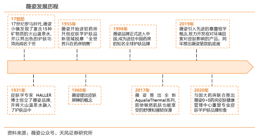 經典案例:根據薇姿公眾號、天風證券研究所等綜合資訊表明,1931年皮膚學專家 HALLER 博士創(chuàng)立了全球第一個醫(yī)美品牌精姿,并將火山溫泉水應用于護膚品中,最初產 品僅在藥房銷售。1998 年,薇姿作為全球知名護膚品配牌進入中國市場,2020 年與國大藥房聯(lián)合推出薇姿 0+0 藥房皮膚健康管理中心,重塑專業(yè)皮膚學護膚品牌形象。薇姿先后提出了皮膚屏障和暴露組學概念,并且致力于研發(fā)應對環(huán)境因子對皮膚影響的產品。