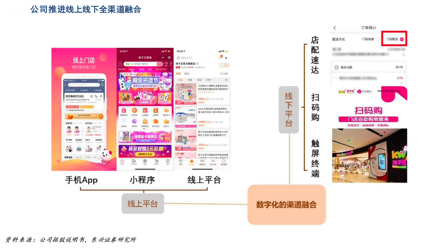 經(jīng)典案例:根據(jù)公司招股說明書、東興證券研究所等綜合資訊表明,孩子王公司已完成線上線下融合的數(shù)字化搭建,消費(fèi)者可通過線上平臺、APP、微信小程序,或線下觸屏終端、“掃碼購”自助下單、“店配速達(dá)”等多種渠道獲得更加流暢、便捷的消費(fèi)體驗(yàn)。其可通過全渠道營銷網(wǎng)絡(luò)建立品牌和用戶互相 感知和交互的多個觸點(diǎn),及時(shí)準(zhǔn)確地滿足消費(fèi)者全方位的消費(fèi)需求。