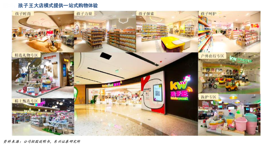 經(jīng)典案例:根據(jù)公司招股說明書、東興證券研究所等綜合資訊表明,孩子王在全國首創(chuàng)大店模式,平均單店面積約 2500 平方米,最大單店面積超過 7000 平方米,且均采取直營模 式,而同業(yè)參與者均以 1000 m²以下的中小店為主,且多以加盟形式為主。其單店面積較大,商品種類豐富,涵蓋了嬰幼兒的衣、食、住、行,為消費(fèi)者提供了“一站式”的良好購物體驗(yàn)。同時(shí),在提供母嬰產(chǎn)品服務(wù)的基礎(chǔ)上,其還提 供兒童游樂場及 母嬰配套服務(wù),增加了玩、學(xué) 、交流互動等體驗(yàn)場景,形成了“商品+服務(wù)+社交”的創(chuàng)新性運(yùn)營模式,在行業(yè)內(nèi)形成了較為獨(dú)特的競爭優(yōu)勢。