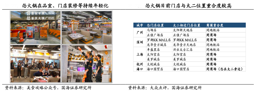 經(jīng)典案例:根據(jù)美食攻略公眾號(hào)、大眾點(diǎn)評(píng)、國(guó)海證券研究所等綜合資訊表明,慫火鍋的慫口號(hào)為“靈魂是 鍋底,頭牌是牛肉”,鍋底僅賣牛油辣搭果蔬鴛鴦鍋、頭牌鮮切黃牛肉一天兩配 絕不過(guò)夜。慫火鍋提出口號(hào)“不是一家火鍋店,而是一間開(kāi)心制造廠”,雇傭高顏值員工并設(shè)置每晚快閃跳舞環(huán)節(jié)“Happy Time”,為顧客提供新奇就餐體驗(yàn)。店內(nèi)裝修延續(xù)太二的年輕化風(fēng)格并以橙紅色為主色調(diào),用賽博朋克工業(yè)風(fēng)突 出“開(kāi)心制造廠”的工廠理念,排隊(duì)等位區(qū)還設(shè)置娃娃機(jī)、冰淇淋機(jī)豐富等位體驗(yàn)。