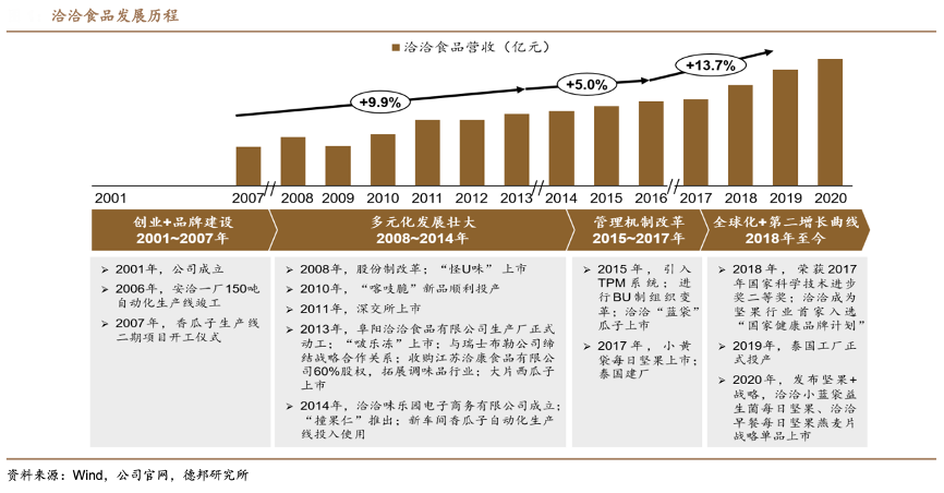 經(jīng)典案例:根據(jù)公司公告、公司官網(wǎng)、民生證券研究院等綜合資訊表明,洽洽以風(fēng)味化創(chuàng)新為突破口,2015年開始拓展藍袋風(fēng)味化瓜子,2016年即開始帶來明確業(yè)績增量,2020年藍袋瓜子含稅收入已突破10億,成為瓜子業(yè)務(wù)的重要增長點。