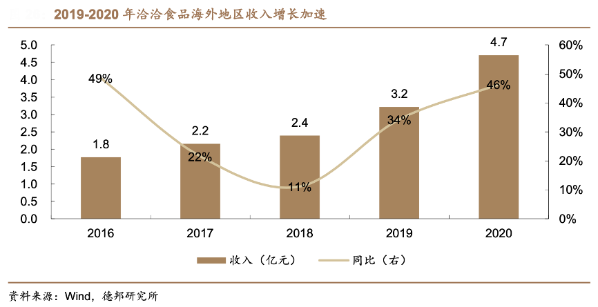 經(jīng)典案例:根據(jù)wind、德邦研究院等綜合資訊表明,目前洽洽食品公司掌握約 40 萬個(gè)終端,紅袋瓜子在一二線等高線城市的滲透率達(dá)到 60~70%,而在低線城市滲透率僅為30%左右,下沉市場仍大有可為。在渠道拓展策略上,公司通過“百萬終端戰(zhàn)略”提高終端覆蓋度,并加大電商、新零售等新渠道的開發(fā),進(jìn)行全渠道發(fā)展。全年海外實(shí)現(xiàn)收入 4.71 億元,同比高增 46.39%, 2016-2020 年復(fù)合增速達(dá) 28%,海外市場已成為公司新的增長點(diǎn)。