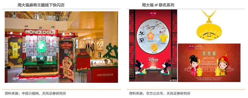 經(jīng)典案例:根據(jù)中國(guó)日?qǐng)?bào)網(wǎng)、官方公眾號(hào)、天風(fēng)證券研究所等綜合資訊表明,周大福與故宮跨界合作,推出“故宮百寶閣”系 列,以朝珠及手串為靈感來(lái)源,選取故宮館藏經(jīng)典文物為原型,延續(xù)故宮的中國(guó)風(fēng)高級(jí)審美。此外,其與全職高手、冰雪奇緣等受年輕人追捧的 IP 產(chǎn)品也均吸引了大批愛(ài)好者。