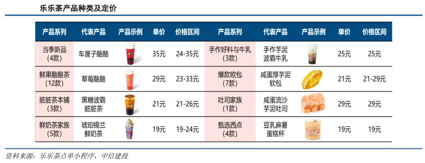 經(jīng)典案例:根據(jù)樂樂茶點(diǎn)單小程序、中信建投等綜合資訊表明,2017 年和 2018 年,樂樂茶推出的臟臟包和臟臟茶引發(fā)新一輪消費(fèi)潮 流。在打造火爆單品基礎(chǔ)上,品牌還推出不同主題的限定“歐包+果茶”組合搭配。目前,樂樂茶的茶飲大約有 5 個(gè)品類總計(jì)近 30 款飲品,軟歐包架上保持有 10 余個(gè) SKU,每月出一兩個(gè)新品。茶飲產(chǎn)品價(jià)格區(qū)間約設(shè)置在 20-33 元左右。