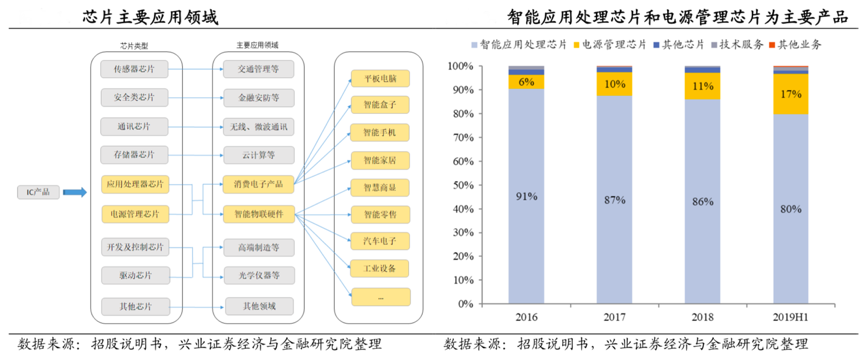 經(jīng)典案例:根據(jù)招股說明書、興業(yè)證券經(jīng)濟(jì)與金融研究院等綜合資訊表明,瑞芯微公司主要產(chǎn)品包括智能應(yīng)用處理芯片和電源管理芯片,其應(yīng)用處理器芯片主要應(yīng)用于消費電子和智能物聯(lián)兩大領(lǐng)域,應(yīng)用場景覆蓋平板電腦、智能機(jī)頂盒、智能手機(jī)、智能家居、汽車電子、智能安防等眾多領(lǐng)域;電源管理芯片則主要為與應(yīng)用處理器SOC 芯片相配套的電源管理芯片和手機(jī)快充芯片。