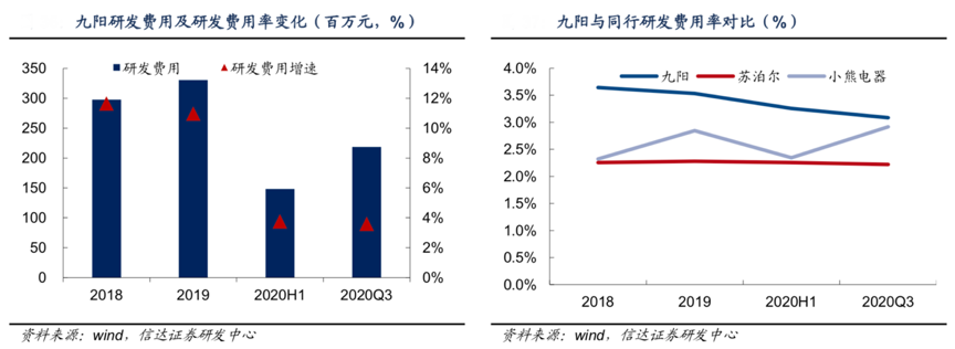 經(jīng)典案例:根據(jù)wind、信達(dá)證券研發(fā)中心等綜合資訊表明,2019年九陽(yáng)研發(fā)費(fèi)用投入 3.30 億元,同比增長(zhǎng)10.99%,2020年其研發(fā)投入增速有所放緩,截至第三季度公司研發(fā)費(fèi)用達(dá) 2.19 億元,同比增長(zhǎng)3.61%,但其研發(fā)費(fèi)用率始終高于同行業(yè)的蘇泊爾、小熊電器等。