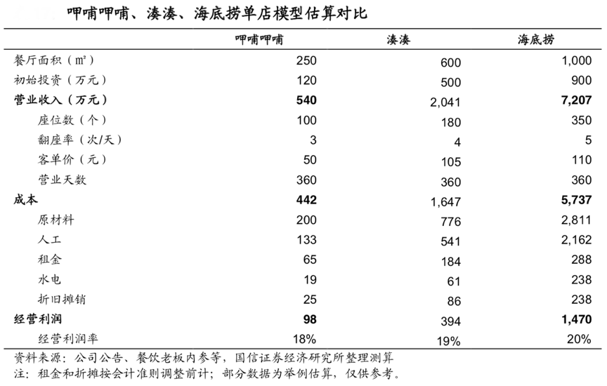 經(jīng)典案例:根據(jù)公司公告、餐飲老板內(nèi)參、國信證券經(jīng)濟(jì)研究所等綜合資訊表明,呷哺呷哺定位“一人一鍋”臺式小火鍋,目標(biāo)客群為 95 后群體,單店面積小、初始投入小,成熟后單店收入規(guī)模在三者中也最小。海底撈定位傳統(tǒng)火鍋,就餐場景和覆蓋人群相比呷哺呷哺和湊湊都更為豐富,門店空間也最大。