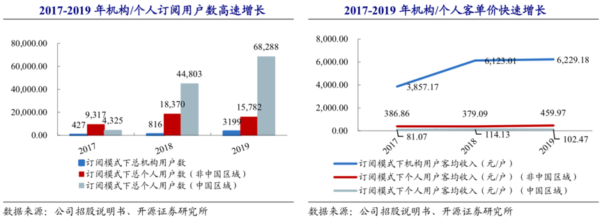 經典案例:根據(jù)公司招股說明書、開源證券研究所等綜合資訊表明,福昕軟件公司訂閱收入的高速增長得益于客戶數(shù)量的快速增長及客單價的提升。其機構/個人訂閱客戶數(shù)量快速增長。2017-2019年其 機構客戶數(shù)量分別為427 戶、 816 戶和 3,199 戶,分別增長 91.10%和 292.03%。隨著公司知名度的提升及公司對中國市場的開拓,非中國區(qū)域與中國區(qū)域的個人客戶數(shù)量均實現(xiàn)較快增長。