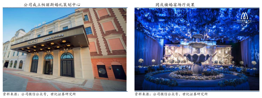 經(jīng)典案例:根據(jù)公司微信公眾號(hào)、世紀(jì)證券研究所等綜合資訊表明,同慶樓借助自身百年老字號(hào)的品牌優(yōu)勢(shì),精準(zhǔn)發(fā)力婚宴市場(chǎng)新藍(lán)海,2014 年前后,其開始成立婚禮中心。2015 年起開始和國(guó)內(nèi)宴會(huì)設(shè)計(jì)師合作,進(jìn)行一站式宴會(huì)酒店的升級(jí)和改造,將原本的傳統(tǒng)宴會(huì)廳改造成主題宴會(huì)廳。其現(xiàn)已形成了自己的婚慶策劃服務(wù)團(tuán)隊(duì),可向新人們提供場(chǎng)地、菜肴、婚禮策劃、主持、攝影等一站式服務(wù)。2019 年,同慶樓在 婚禮堂又進(jìn)行了不同形態(tài)的嘗試調(diào)整,成立帕麗斯婚禮策劃中心,升級(jí) 9 家 門店 12 個(gè)明星宴會(huì)廳,宴會(huì)菜肴同步全面升級(jí)。