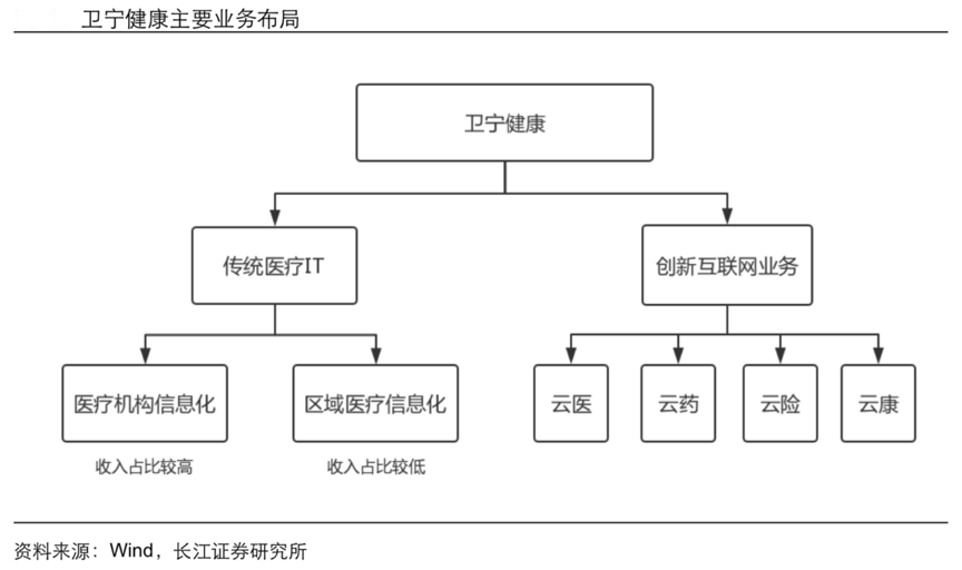 經典案例:根據(jù)wind、長江證券研究所等綜合資訊表明,衛(wèi)寧健康始終堅持“雙輪驅動”的核心發(fā)展戰(zhàn)略,其專注于醫(yī)療機構信息化領域,截至 2019 年底已覆蓋超過 6000 家醫(yī)療機構,其中三級以上醫(yī)院數(shù)量超過 400 家,形成全國布局的銷售與本地化服務團隊,并在在線診療、醫(yī)藥、健康管理等方面均有積極探索,以創(chuàng)新業(yè)務布局引領行業(yè)。