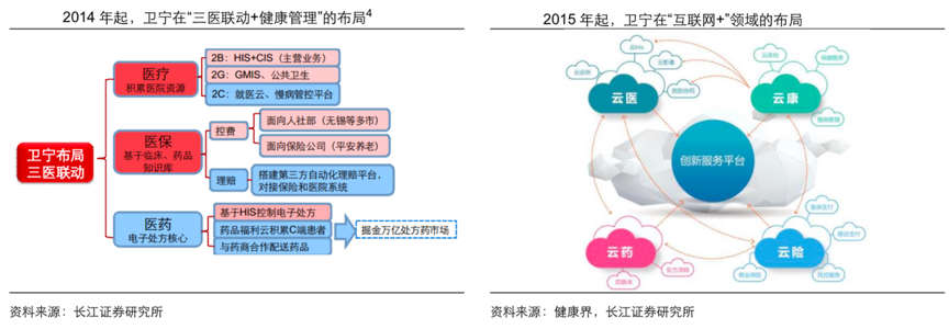 經典案例:根據(jù)健康界、長江證券研究所等綜合資訊表明,衛(wèi)寧健康從2014 年起,從狹義的醫(yī)院信息化走向醫(yī)療、醫(yī)保、醫(yī)藥三醫(yī)聯(lián)動促進行業(yè)橫向擴容;進軍 O2O 應用、可穿戴設備等將激活 C 端健康管理大市場;2015年起,構建四朵云(云醫(yī)、云藥、云康、云險)+ 一平臺(創(chuàng)新服務中心)的創(chuàng)新業(yè)務體系,打通智慧健康產業(yè)鏈。