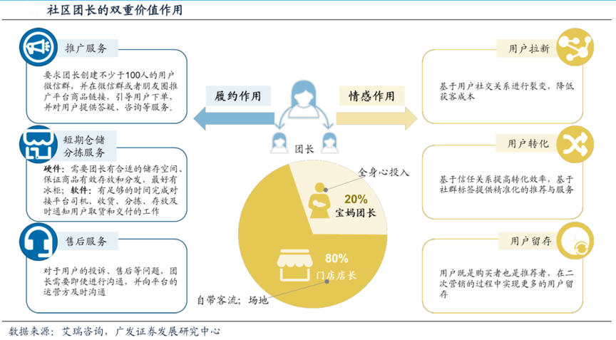 經(jīng)典案例:根據(jù)艾瑞咨詢、廣發(fā)證券發(fā)展研究中心等綜合資訊表明,結(jié)合美團(tuán)優(yōu)選團(tuán)長端申請合同明文規(guī)定,團(tuán)長需要承擔(dān)推廣、分揀、短 期儲存、售后四個具體職責(zé),來滿足用戶相關(guān)需求。其中的推廣服務(wù)最為顯著,美團(tuán)優(yōu)選要求 團(tuán)長創(chuàng)建不少于100人的用戶微信群,并在微信群或者朋友圈推廣平臺商品鏈接,引導(dǎo)用戶下單,并對用戶提供答疑、咨詢等服務(wù)。