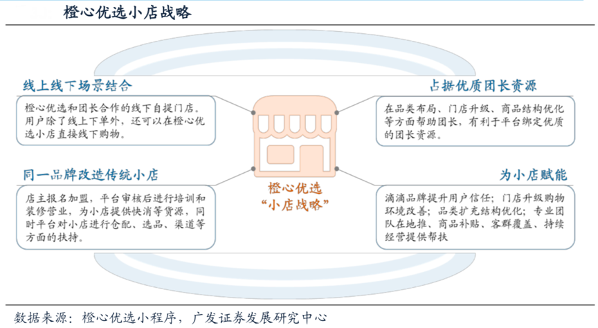 經(jīng)典案例:根據(jù)橙心優(yōu)選小程序、廣發(fā)證券發(fā)展研究中心等綜合資訊表明,2020年10月,橙心優(yōu)選在成都開出第一家線下自營(yíng)實(shí)體店——橙心優(yōu)選超市,以期通過(guò)將線上引流至線下,完成線上拼團(tuán)、線下自主挑選的閉環(huán)。與傳統(tǒng)夫妻老婆店相比,橙心優(yōu)選小店具有更專業(yè),線上數(shù)據(jù)更豐富的優(yōu)勢(shì),可以幫助平臺(tái)占據(jù)優(yōu)勢(shì)團(tuán)長(zhǎng)資源。