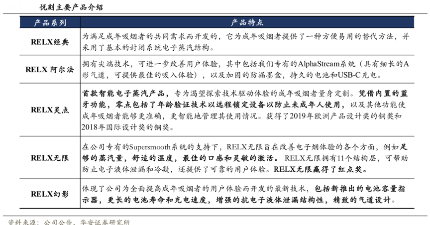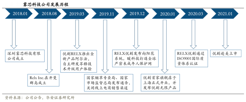 經(jīng)典案例:根據(jù)公司公告、華安證券研究所等綜合資訊表明,霧芯科技公司在2018年 3 月發(fā)布第一代電子煙產(chǎn)品并迅速打開市場。2019 年,公司成立了國內(nèi)首個(gè)獨(dú)立電子煙品牌實(shí)驗(yàn)室 RELX Lab。2019 年 3 月,公司推出全新系列產(chǎn)品阿爾法。2019 年 9 月,悅刻靈點(diǎn)智能霧化煙發(fā)布。2019年其發(fā)布向陽花系統(tǒng),打造全球嚴(yán)密未成年人保護(hù)網(wǎng)。