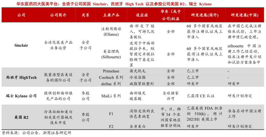 經(jīng)典案例:根據(jù)公司公告、浙商證券研究所等綜合資訊表明,華東醫(yī)藥全資子公司英國 Sinclair、西班牙HighTech 以及參股公司美國R2、 瑞士 Kylane 四個全球化研發(fā)中心,進一步整合研發(fā)資源和能力,在面部填充劑、身體塑 形、埋線、能量源器械等領(lǐng)域不斷開發(fā)國際高端醫(yī)美產(chǎn)品技術(shù)及核心產(chǎn)品,積極優(yōu)化提升產(chǎn)品結(jié)構(gòu),豐富和完善產(chǎn)業(yè)布局。