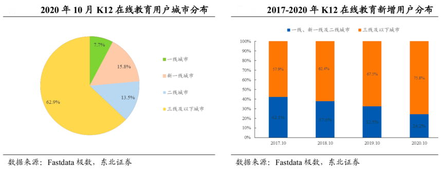經(jīng)典案例:根據(jù)Fastdata極數(shù)、東北證券等綜合資訊表明,用戶生源結(jié)構(gòu)方面,學(xué)而思網(wǎng)校的付費用戶主要來自一二線城市,疫情發(fā)生前 80% 左右的用戶來自一二線城市,20%左右來自低線城市。跟誰學(xué)的用戶分布相對更均勻,2019年上半年,新生中約一半來自一二線城市,另一半來自低線城市。新東方 在線則雙管齊下,中小學(xué)網(wǎng)校面向一二線城市用戶,東方優(yōu)播則主攻低線城市。