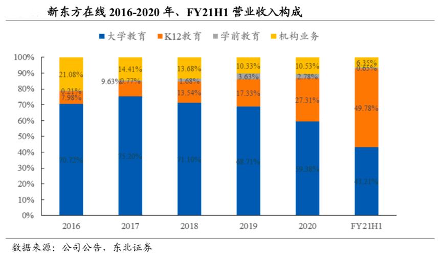 經(jīng)典案例:根據(jù)公司公告、東北證券等綜合資訊表明,從收入結(jié)構(gòu)來看,大學(xué)教育是新東方在線公司的基石業(yè)務(wù),2020財年占公司營收達59.38%,K12 教 育近年來快速擴張,2020 財年占公司營收達 27.31%,同比增長9.99pct,自 2019 財年超越機構(gòu)業(yè)務(wù)成為營收規(guī)模第二大的業(yè)務(wù)。