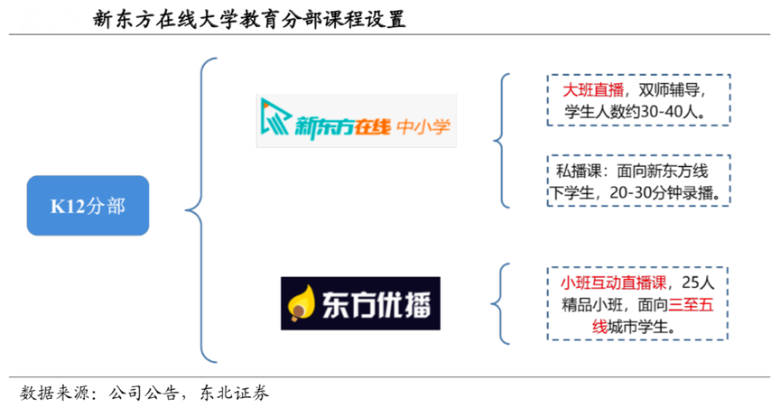 經典案例:根據公司公告、東北證券等綜合資訊表明,新東方在線平臺自身的 K12 課程通過中小學網校以大班雙師直播的模式提供,更于2017年推出私播課,以錄播課程的模式提供給學習新東方線下課程后有意 愿繼續(xù)線上學習的學生。東方優(yōu)播則依靠北京優(yōu)質教學基礎,面向三至五線城市學生,以小班互動直播課 的模式提供課程服務。
