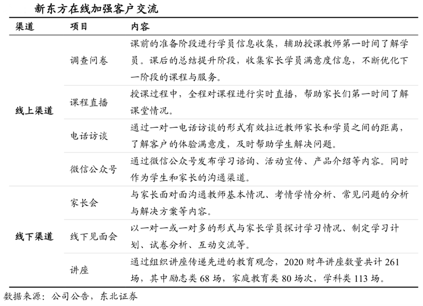 經典案例:根據公司公告、東北證券等綜合資訊表明,新東方在線多維度開展課后服務,加強用戶粘性及續(xù)班率。其不定期以多種方式與學員、家長進行溝通, 線上通過調查問卷、課程直播、電話訪談、微信公眾號等形式不斷優(yōu)化課程服務,線下通過家長會、見面會、講座等形式維護客戶關系,多維度促進學員成績提升、收獲家長信任。