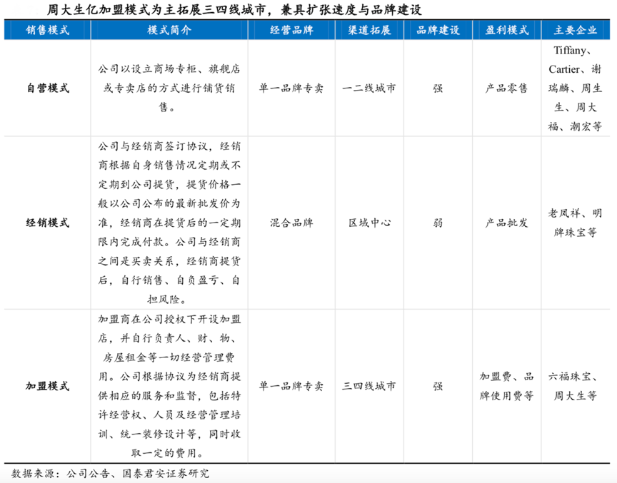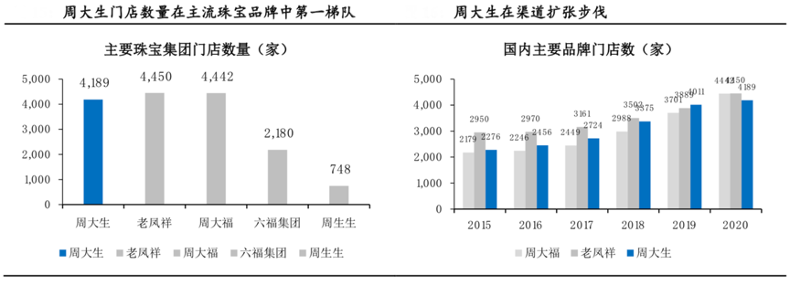 經(jīng)典案例:根據(jù)公司公告、國(guó)泰君安證券研究等綜合資訊表明,周大生在成立的十年間完成了“千店計(jì)劃”,精準(zhǔn)定位三四線城市相對(duì)藍(lán)海市場(chǎng),率先渠道下沉,選擇加盟模式迅速拓渠道,擴(kuò)規(guī)模。至 2020 年末,周大生門店共計(jì) 4,189 家,在行業(yè)內(nèi)屬于第一梯隊(duì)。