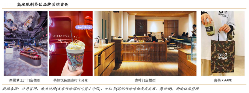 經(jīng)典案例:根據(jù)公司官網(wǎng)、看點(diǎn)快報(bào)、小紅書、西南證券等綜合資訊表明,高端現(xiàn)制茶飲品牌正積極打造年輕人的“社交貨幣”,獲得品牌流量。喜茶黑金、奈雪夢(mèng)工廠等超級(jí)大店模型適合拍照打卡,成為適合閑暇社交的“第三空間”。高端價(jià)位+新潮產(chǎn)品,讓好看好拍好分享的現(xiàn)制茶成為年輕人的社交貨幣;喜茶、奈雪與NIKE、AAPE 等知名品牌一年十余次的跨界聯(lián)名增強(qiáng)了品牌背書,同時(shí)互換了流量、粉絲,而煮葉通過煮茶師專業(yè)耐心的演示講解、茶顏悅色通過“永久求償權(quán)”和貼心的顧客服務(wù)與消費(fèi)者之間形成了品牌獨(dú)特的待客 標(biāo)簽。
