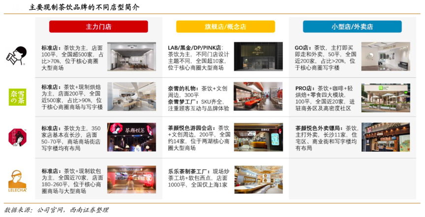 經(jīng)典案例:根據(jù)公司官網(wǎng)、西南證券等綜合資訊表明,部分現(xiàn)制茶飲品牌嘗試多種店型運(yùn)作,逐步優(yōu)化渠道組合。其主力店以外的門店拓展分為兩個(gè)大類,第一類以展示品牌形象、增加消費(fèi)者互動(dòng)為目的,這類店型面積大、設(shè)計(jì)交互感強(qiáng),如奈雪 夢(mèng)工廠、茶顏悅色游園會(huì);第二類以提升單店效率為目的,側(cè)重即買即走和外賣業(yè)務(wù),門店面積小、讓高端品牌將渠道拓展至辦公場(chǎng)所、社區(qū)的同時(shí),如奈雪 PRO、喜茶 GO等。