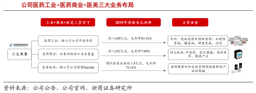 經(jīng)典案例:根據(jù)公司公告、公司官網(wǎng)、浙商證券研究所等綜合資訊表明,華東醫(yī)藥公司業(yè)務(wù)覆蓋醫(yī)藥全產(chǎn)業(yè)鏈,以醫(yī)藥工業(yè)為主導(dǎo),積極拓展醫(yī)藥商業(yè)和醫(yī)美產(chǎn)業(yè),已發(fā)展成為集醫(yī)藥研發(fā)、生產(chǎn)、經(jīng)銷為一體的大型綜合性醫(yī)藥公司。其醫(yī)藥商業(yè)收入占比 69%,毛利率 7.7%,是其公司收入主要來源,擁有中西藥、醫(yī)療器械、藥材參茸、健康產(chǎn)業(yè)四大業(yè)務(wù)板塊。2019年其醫(yī)藥商業(yè)板塊營收達(dá)到 251 億元,繼續(xù)保持浙江省龍頭地位。