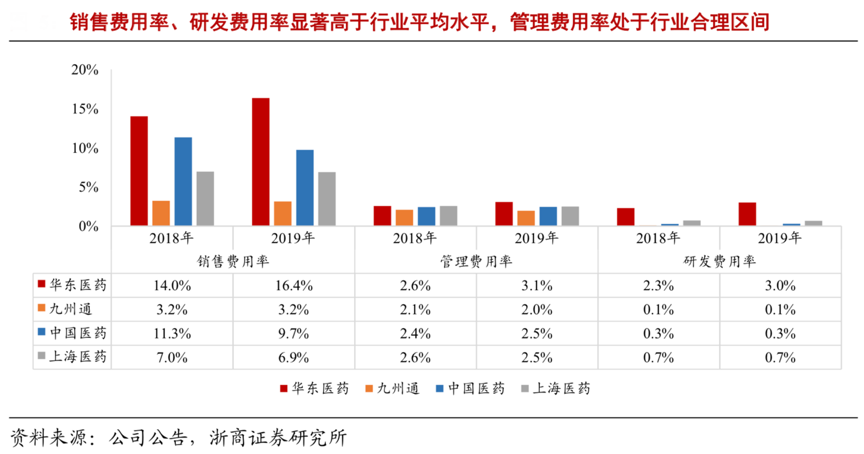 經(jīng)典案例:根據(jù)公司公告、浙商證券研究所等綜合資訊表明,華東醫(yī)藥公司是國內(nèi)少有的醫(yī)藥工商業(yè)一體龍頭,銷售費用率、研發(fā)費用率明顯高于行業(yè)平均水平,管理費用率接近行業(yè)均值。2019年其共投入 10.7 億元用于研發(fā),同比增長52%,研發(fā)費用率 3.0%高于行業(yè)平均水平,加大研發(fā)投入以夯實龍頭地位。