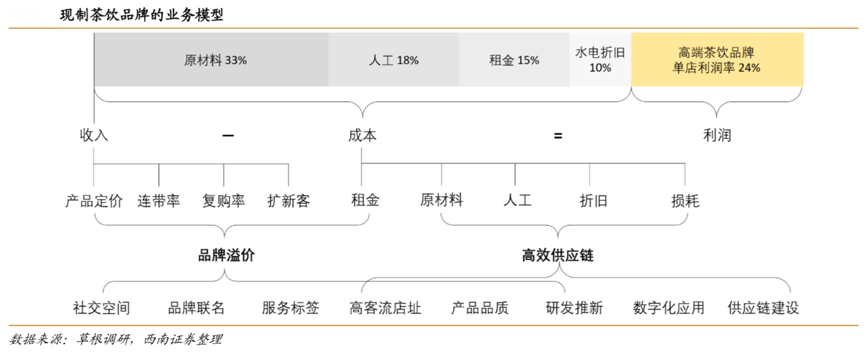 經(jīng)典案例:根據(jù)草根調(diào)研、西南證券等綜合資訊表明,現(xiàn)制茶飲產(chǎn)品性質(zhì)決定了其產(chǎn)品同質(zhì)化高、復購頻率較咖啡低、30 歲+消費群體滲透率偏低的特點,因此需要通過品牌營銷、入駐核心商圈獲得高客流、通過新品開發(fā)拉新客提復購,來保障同店訂單量及利潤空間。而在成本端,品牌溢價獲得租金優(yōu)勢,規(guī)?;少徍蛿?shù)字化應用優(yōu)化成本結(jié)構。