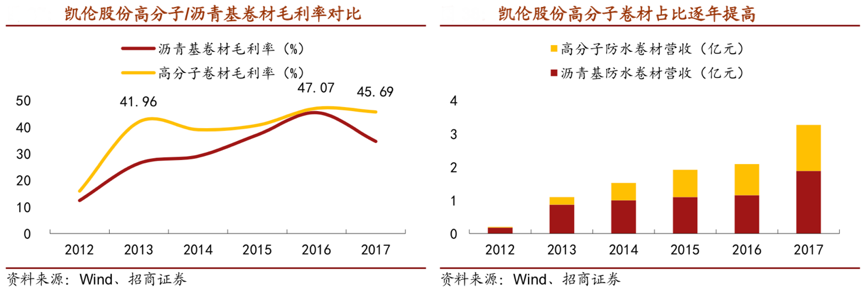 經(jīng)典案例:根據(jù)wind、招商證券等綜合資訊表明,高分子防水材料相較于傳統(tǒng)防水材料,其原材料對瀝青依賴度較低,對瀝青價格變化敏感度下降,毛利率水平更高且更穩(wěn)定。防水行業(yè)內(nèi)三家可比上市企業(yè)均在發(fā)力投產(chǎn)高分子卷材、高分子涂料,其中,凱倫股份作為國內(nèi)防水領(lǐng)域?qū)9ジ叻肿泳聿牡念^部企業(yè),2017年高分子卷材營收占比超卷材總營收的40%。