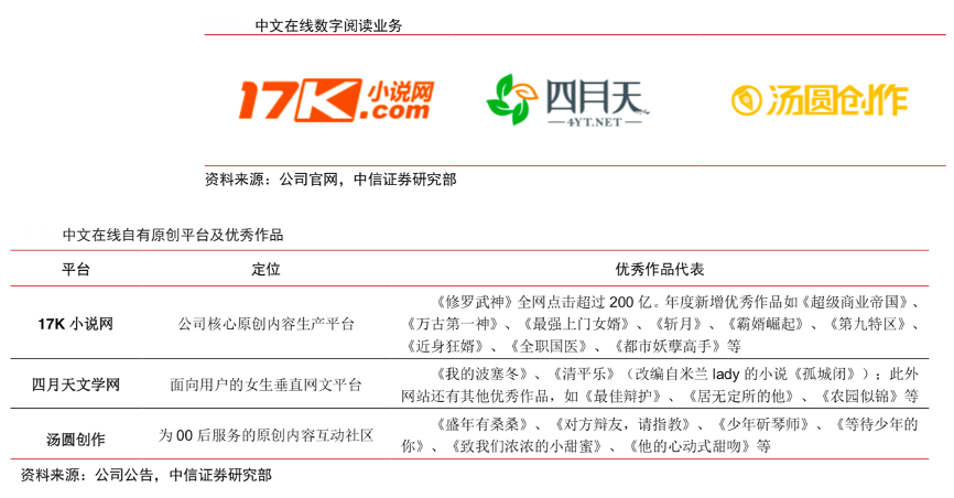 經(jīng)典案例:根據(jù)公司官網(wǎng)、公司公告及中信證券研究部等綜合資訊表明,中文在線公司積累了大量優(yōu)質(zhì)內(nèi)容,以自有原創(chuàng)平臺(tái)、知名作家、版權(quán)機(jī) 構(gòu)為正版數(shù)字內(nèi)容來源,截至 2020 年上半年,其擁有數(shù)字內(nèi)容資源超 460 萬種,駐站 作者 390 萬人,與 600 余家版權(quán)機(jī)構(gòu)合作,簽約知名作家、暢銷書作者 2000 余位。其公司旗下?lián)碛?7K 小說網(wǎng)、四月天小說網(wǎng)、湯圓創(chuàng)作三大原創(chuàng)網(wǎng)絡(luò)平臺(tái)。