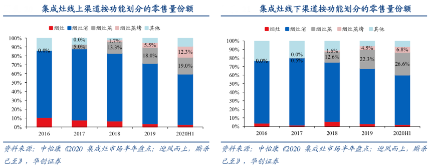 經(jīng)典案例:根據(jù)中怡康、華創(chuàng)證券等綜合資訊表明,蒸箱集成灶推出后,市場(chǎng)經(jīng)過(guò)短期教育普及,自 2017 年起份額開(kāi)始迅速擴(kuò)張,并作為除煙灶消之外的第二大品類快速覆蓋市場(chǎng),隨后蒸烤款也逐步跟進(jìn)。據(jù)中怡康披露,至 2020H1 集成 灶線上、線下的蒸箱款集成灶銷量占比分別達(dá)到 19%和 26.6%,并憑借功能集成保持較強(qiáng)替代性。