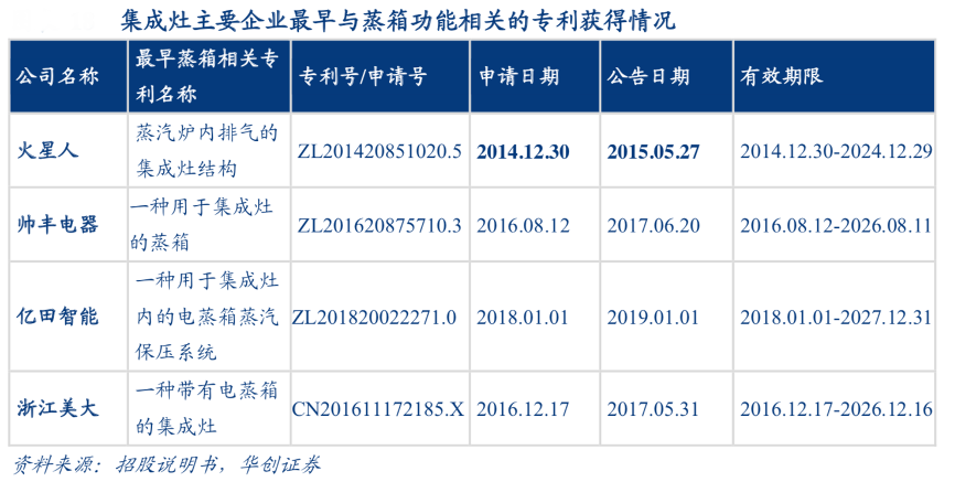 經(jīng)典案例:根據(jù)招股說(shuō)明書、華創(chuàng)證券等綜合資訊表明,相較第二代集成灶的煙+灶+消毒柜的套系組合,火星人敏銳洞察消費(fèi)潛在需求,認(rèn)為“蒸”作為中國(guó)傳統(tǒng)烹飪習(xí)慣將是集成灶新代際的切入點(diǎn),在很早開(kāi)始布局蒸箱功能的研 發(fā)。對(duì)比各集成灶企業(yè)披露的蒸箱款相關(guān)專利,火星人于 2014 年底即已率先擁有蒸箱功能技術(shù),憑此成為業(yè)內(nèi)最早一批布局蒸箱款集成灶的企業(yè)。