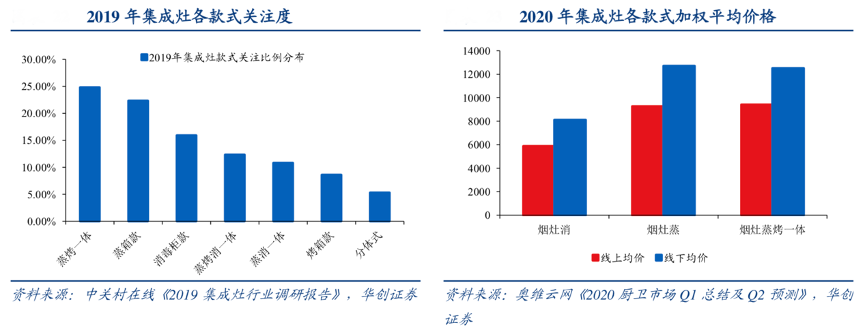 經(jīng)典案例:根據(jù)中關(guān)村在線、奧維云網(wǎng)、華創(chuàng)證券等綜合資訊表明,蒸箱款代表的新功能模塊保持高市場關(guān)注度,且形成較高產(chǎn)品溢價(jià)。據(jù)中關(guān)村在線 用戶統(tǒng)計(jì),至 2019 年集成灶關(guān)注度中,蒸烤一體款和蒸箱款位列前兩位,占比分別 為 24.8%、22.3%。同時(shí)據(jù)奧維數(shù)據(jù) 2020 年蒸箱款均價(jià)較煙灶消款式線上線下均高出約 57%,新功能模塊享受較高市場溢價(jià)。而火星人高占比的新模塊 SKU 比例促成其在這一產(chǎn)業(yè)升級浪潮中率先突圍。