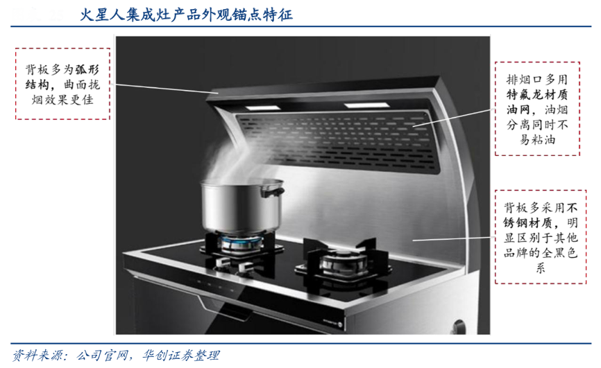 經(jīng)典案例:根據(jù)公司官網(wǎng)、華創(chuàng)證券等綜合資訊表明,火星人旗下產(chǎn)品普遍具有共性的設(shè)計(jì)錨點(diǎn),提升產(chǎn)品功能的同時(shí)有效提高辨識度。其采用不銹鋼材質(zhì),與其他品牌不同,火星人集成灶背板部分均采用不銹鋼材質(zhì),銀黑相間的外觀樣式更具辨識度。